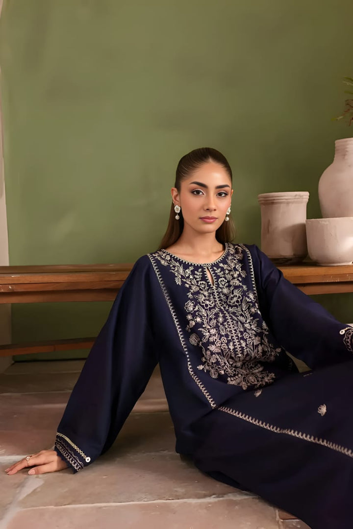 VESTIA BRAND's 2PC LONG LENGTH EMBROIDERY DRESS IN NAVY BLUE COLOUR, THE EMBROIDERY WAS IN OFF WHITE COLOUR, AVAILABLE IN 4 SIZES,